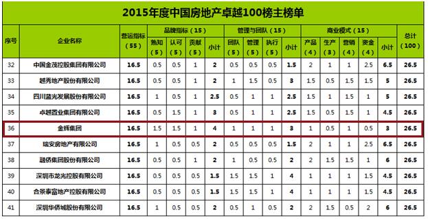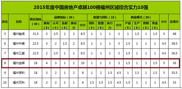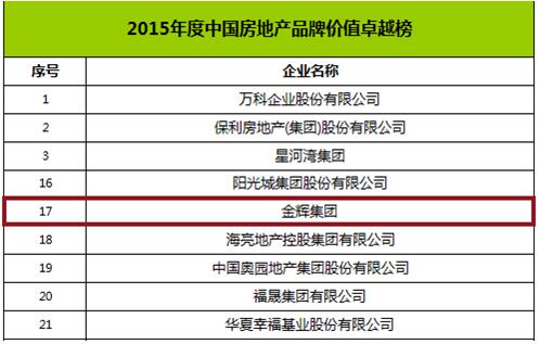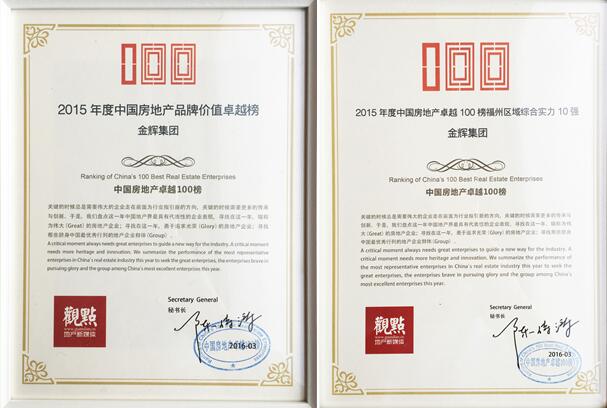 2016年3月22日,在剛剛結(jié)束的2015年度中國房地產(chǎn)卓越榜發(fā)布會上,金輝集團(tuán)榮膺 “年度中國房地產(chǎn)品牌價值卓越榜17強”、“年度中國房地產(chǎn)卓越100榜36強”、 “福州區(qū)域綜合實力10強榜8強”三項榮譽。